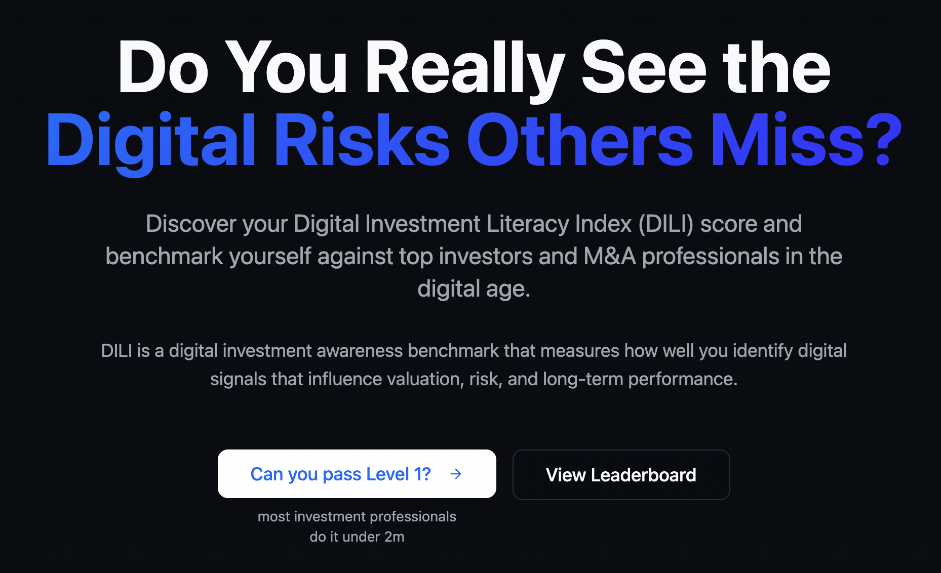 DILI allows family offices, private equity firms, institutional LPs and M&A advisors to assess their digital-risk literacy against top-performing professionals — all within minutes. By highlighting digital blind spots that can quietly erode value at scale, DILI empowers investors to make informed decisions with speed and precision.